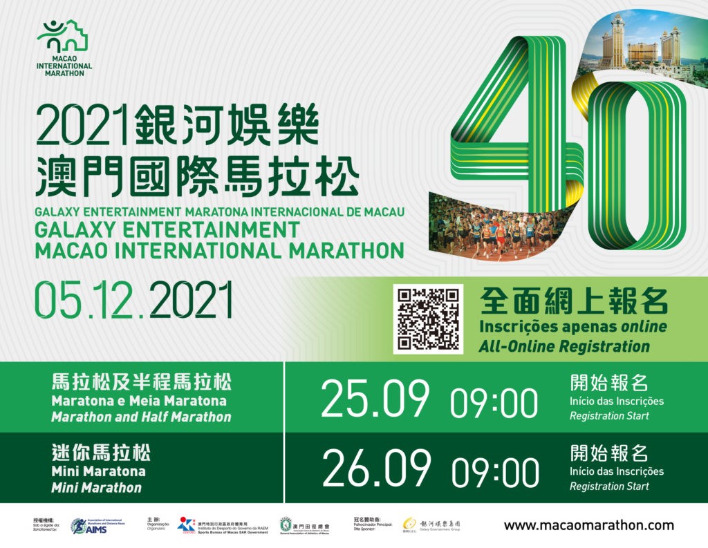 由體育局及澳門田徑總會主辦,銀河娛樂集團冠名贊助的「2021銀河娛樂澳門國際馬拉松」將於本年12月5日(周日)舉行。今年賽事將全面採用網上報名的方式,並將於9月25日(周六)及9月26日(周日)上午9時起接受報名,而為配合防疫措施,所有參賽者須於比賽前14天或之前(即11月21日或之前)完成接種兩劑新型冠狀病毒疫苗,並於比賽前自行安排進行核酸檢測及必須於比賽期間持有有效的核酸檢測陰性證明方可參賽。