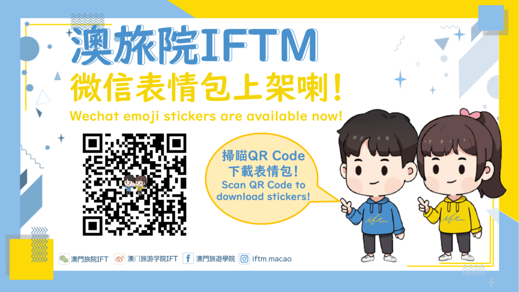 澳門旅遊學院正能量微信表情包由即日起可於微信貼圖市集搜索“澳旅院”下載或附圖二維碼( https://w.url.cn/s/ABZgvKL#wechat_redirect ),歡迎各界使用,齊來了解澳門旅遊學院以學生為本的教學理念和精彩多元的校園文化。