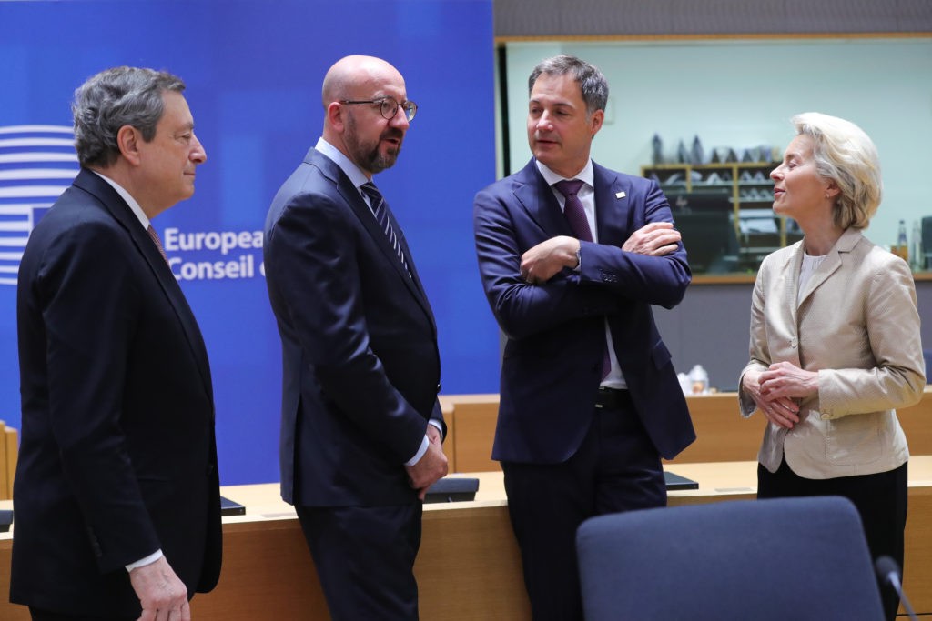 5月31日,在比利時布魯塞爾,意大利總理德拉吉、歐洲理事會主席米歇爾、比利時首相德克羅和歐盟委員會主席馮德萊恩在歐盟特別峰會開始前交談。