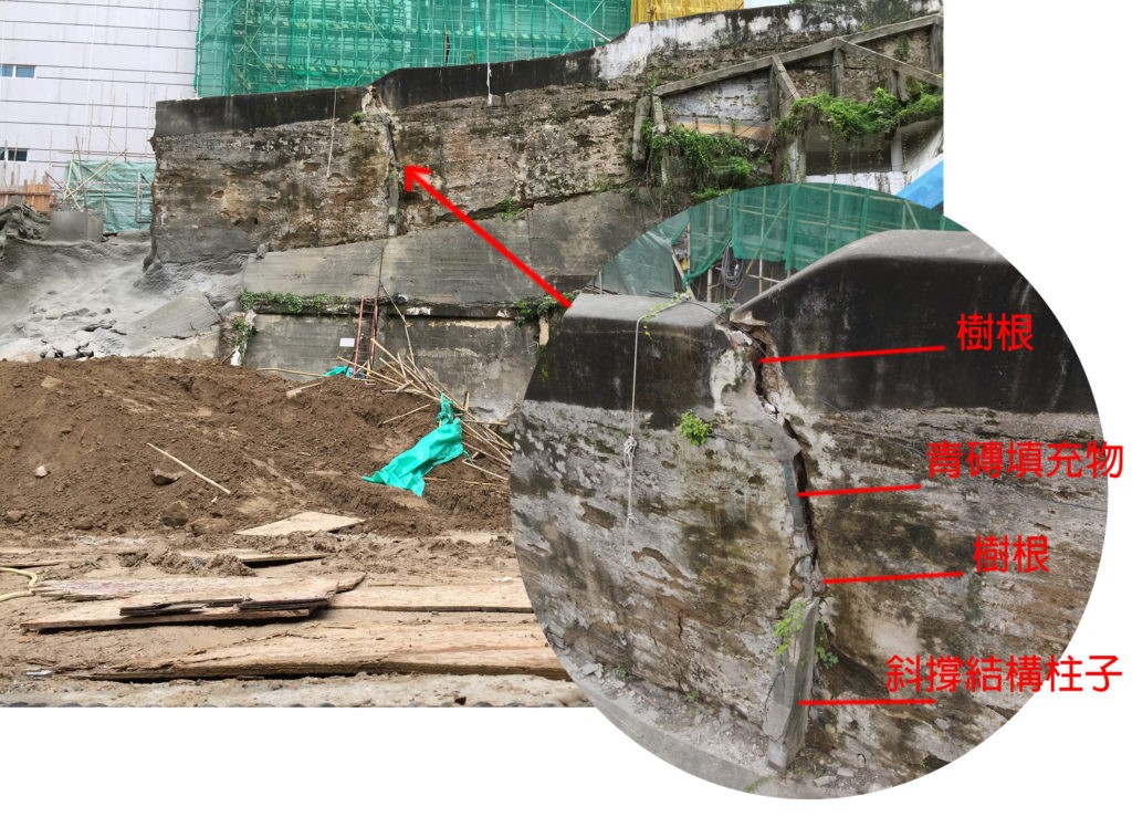 另外,他指出,由於坍塌事故發生之前,城牆遺址一直被工程網遮蓋,甚麼時候該舊裂縫開始出現向外傾亦無從推斷。然而,從6月10日的照片可見(圖2),該牆體外側的竹棚有以繩及金屬錨固定在城牆內側牆身,竹棚的重量及風作用在工程網的作用力,會否引起牆體上述向外位移,以及坍塌事故之前,城牆內側牆基旁邊有開挖情況,這些因素都需要加入考慮之列。