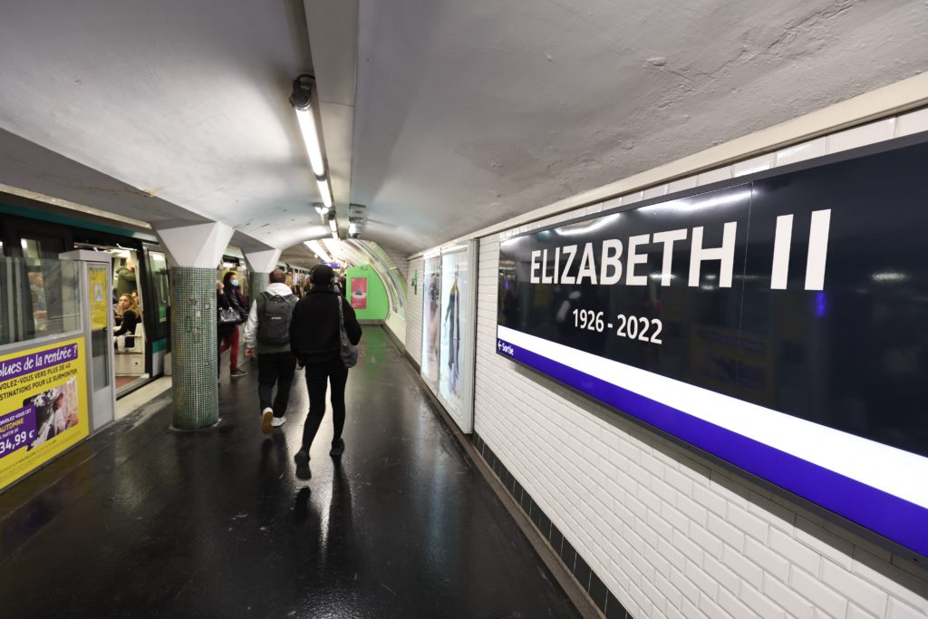 巴黎大眾運輸公司(RATP)發言人告訴法新社:「我們希望在這一天共同表達哀思,因此把『伊麗莎白二世 1926-2022』的標誌放到1號線的喬治五世站內」。 這個地鐵站明天就會改回喬治五世站的原本名稱。