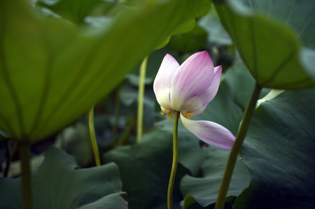 而荷花是典型的挺水植物。它的地下莖,亦是大眾熟悉的「蓮藕」,生於水底的淤泥中,花和葉則由長柄挺出水面,「出淤泥而不染」。荷花有特別的結構以適應水生環境:它的葉柄與地下莖裏面都有中空的管道,方便植株於水中的缺氧環境透氣呼吸,而它葉片表面有一層蠟質,令濺起的水珠快速流走。