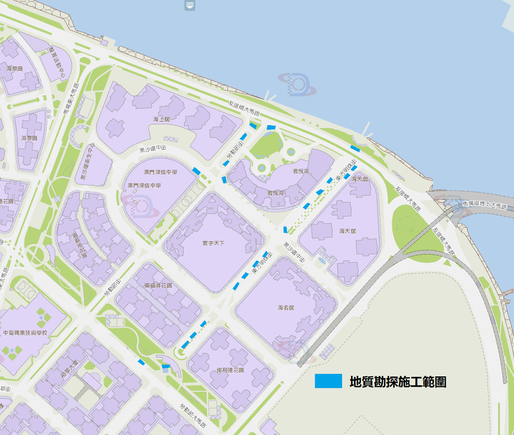 輕軌東線工程將開展地質勘探和設計工作,今日起至三十一日分階段於勞動節大馬路、勞動節街、黑沙環中街、東方明珠街、友誼橋大馬路及黑沙環公園周邊開展。屆時每個勘探點預料需 3至 4天臨時佔用部分行人路、停車位及公園等公共區域。另外,亦會逐步開展施工範圍的圍街板工作。
