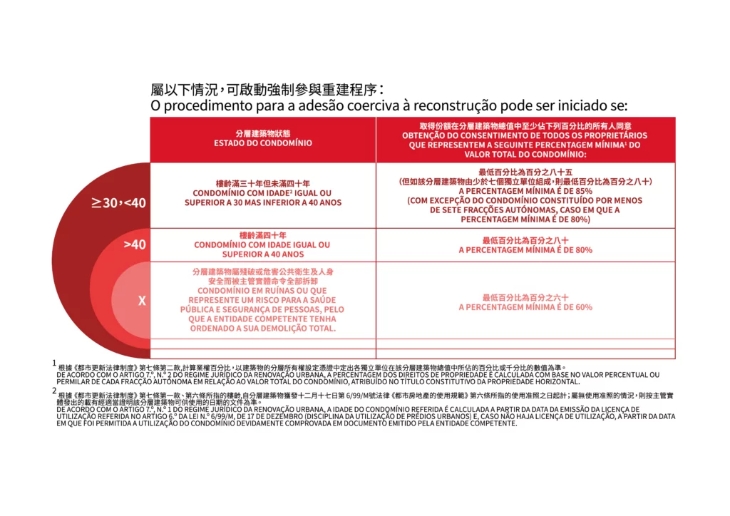 其後,符合《都市更新法律制度》第六條規定的業權最低百分比的所有權人及倘有的擬增建獨立單位的取得人,須以重建方案為基礎,透過公證書方式訂立一份重建協議。倘若重建協議在簽訂起四年內,未能取得分層建築物全體所有權人的同意,則協議失效。然而,倘若屬強制參與重建程序的情況,則任一訂立重建協議的所有權人可透過強制參與重建程序,以全體訂立重建協議的所有權人名義,強制剩餘未簽署該協議的所有權人參與重建。