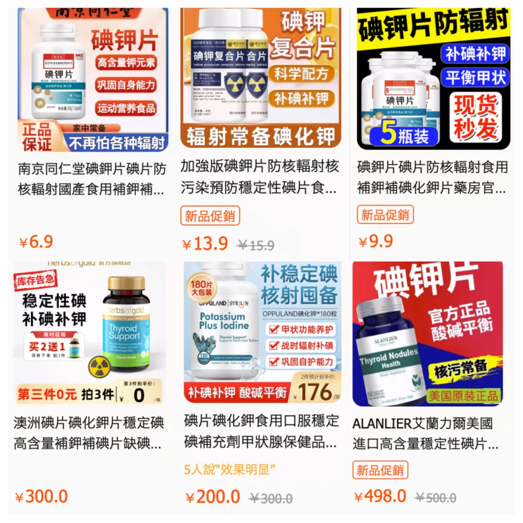 內地媒體《央廣網》記者在在網購平台搜索「碘鉀片」時,商品在推薦頁圖片和標題中,直接寫上「輻射常備碘鉀片」、「防護核污染」等關鍵詞。
