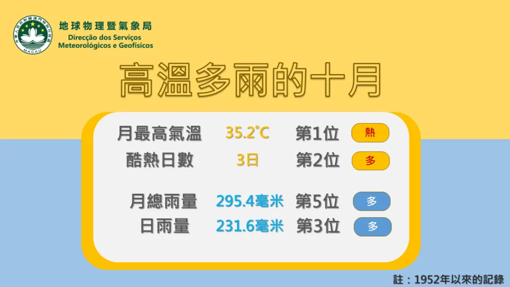 另外,澳門10月份累積降雨量 295.4毫米,為本澳 30年氣候平均值約 4倍,其中 10月9日的日累積雨量達到 231.6毫米,為 71年來 10月的第 3高日雨量,主要是受「小犬」的雲雨帶影響。