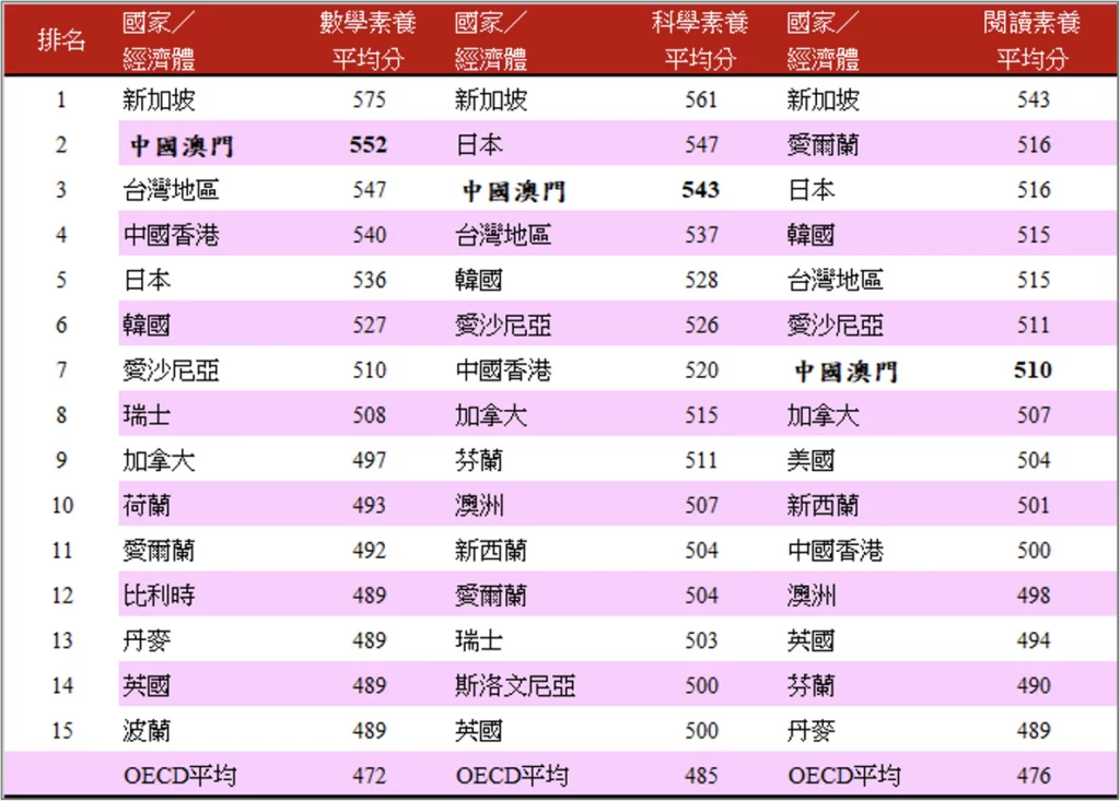 經濟合作與發展組織(OECD)在昨日全球同步公佈PISA成績,澳門在閱讀、數學、科學三個測試領域中,均獲高於國際平均標準。共91個國家或經濟體參與PISA 2022,在數學測試中,澳門以552分排第二;科學測試中,澳門得分543排第三;閱讀測試中,澳門得分510排第七。新加坡均在三項測試中領頭,香港在三項測試中分別排第四、第七和第十一。