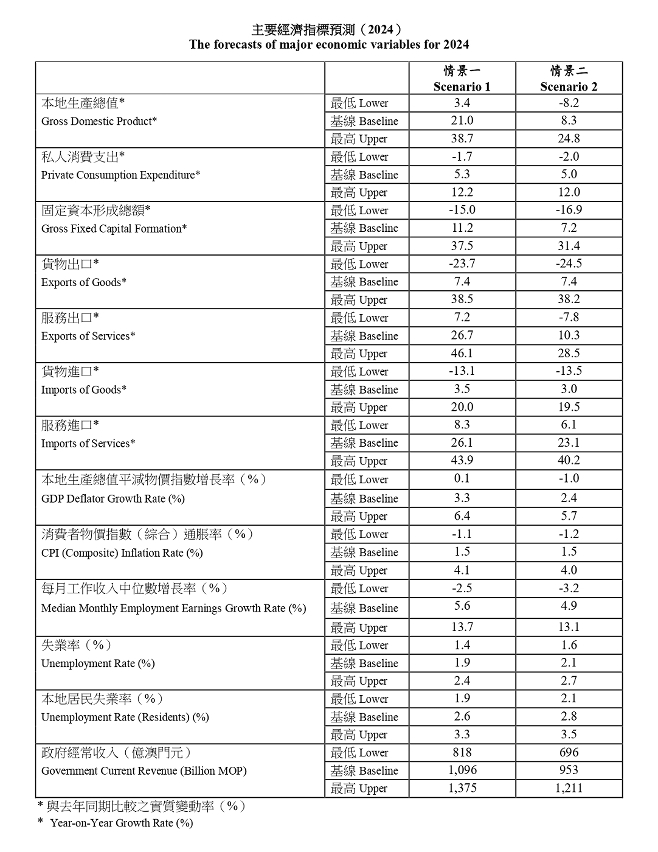課題組指若內地經濟增長放緩對澳門的影響較小,內地旅客人數持續有較高增長,且明年內地旅客人數回復到2019年水平,本地生產總值的基線預測增長21.0%4,222億元,政府收入預計達到1,096億元,本地居民失業率預計為2.6%;若內地經濟增長放緩對澳門的影響較大,內地旅客人數只有很低增長,僅比2023年增加5%,預計本地生產總值的基線增長8.3%3,776億元,預計政府收入為953億元,本地居民失業率預計為2.8%