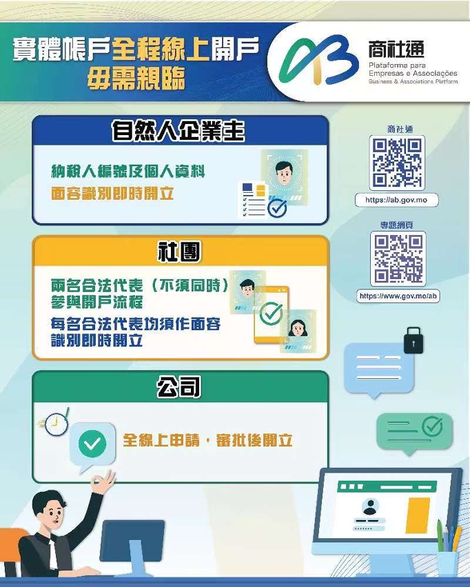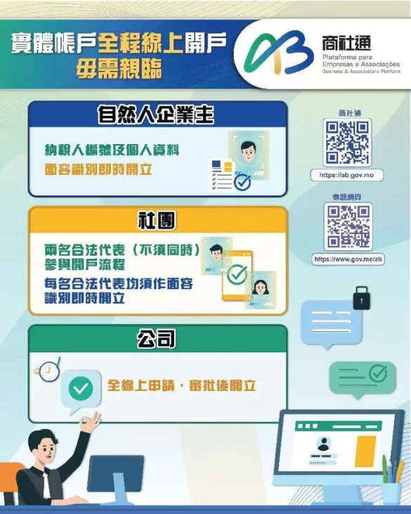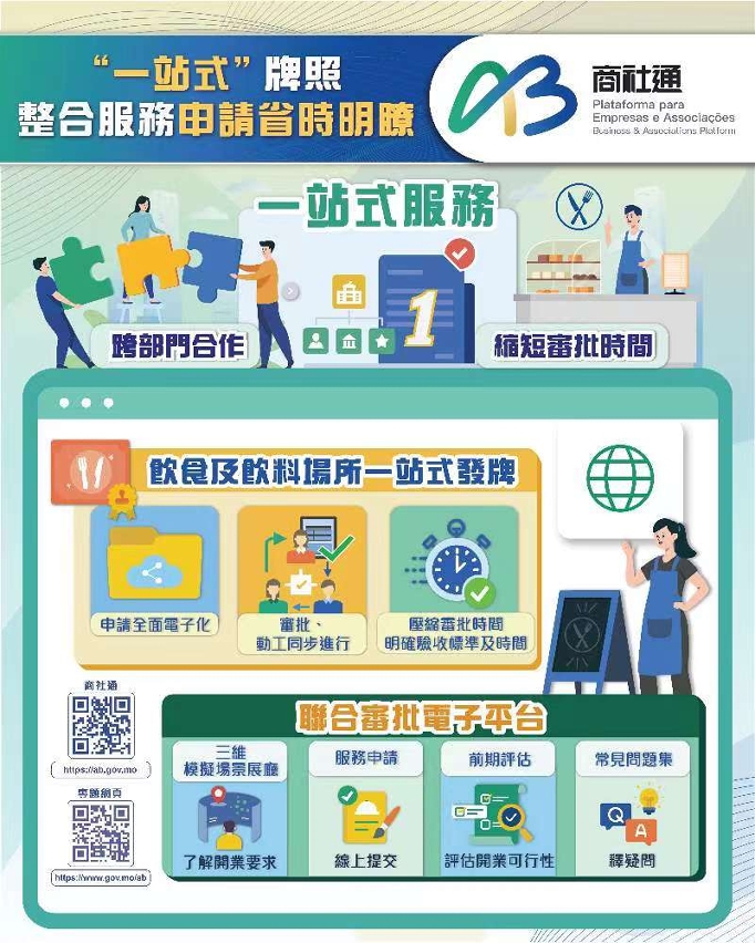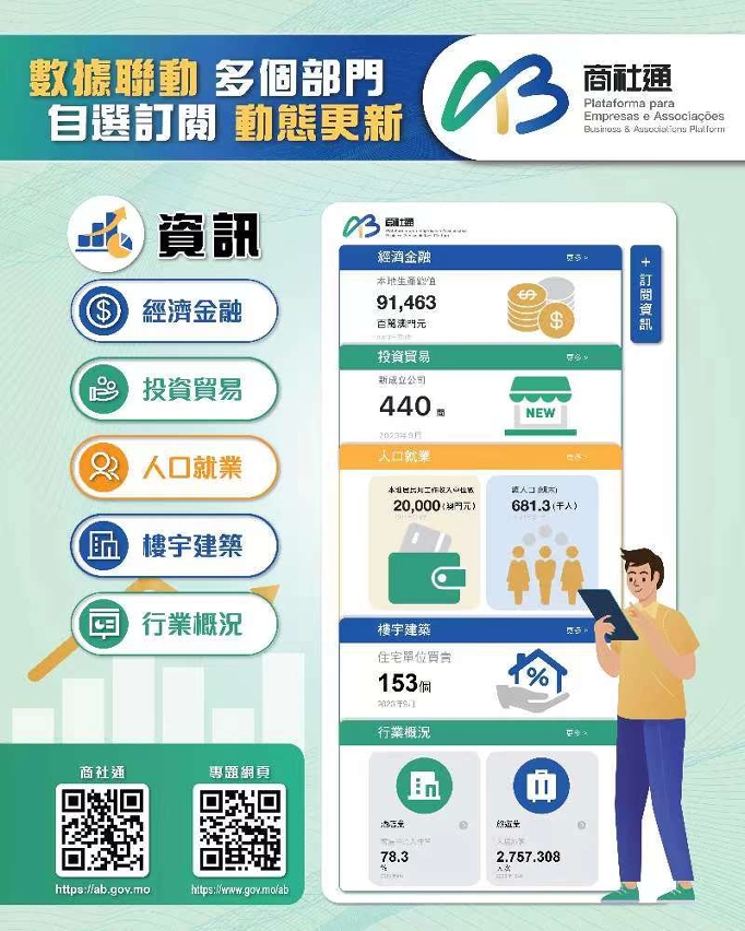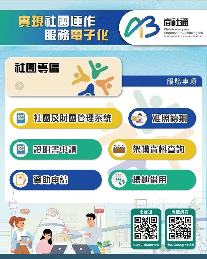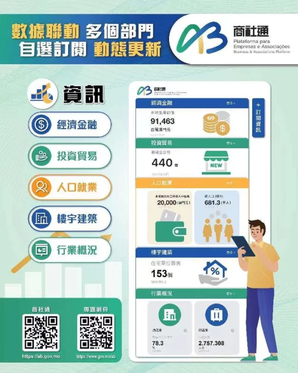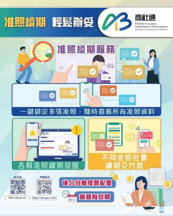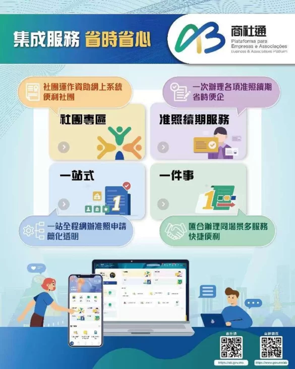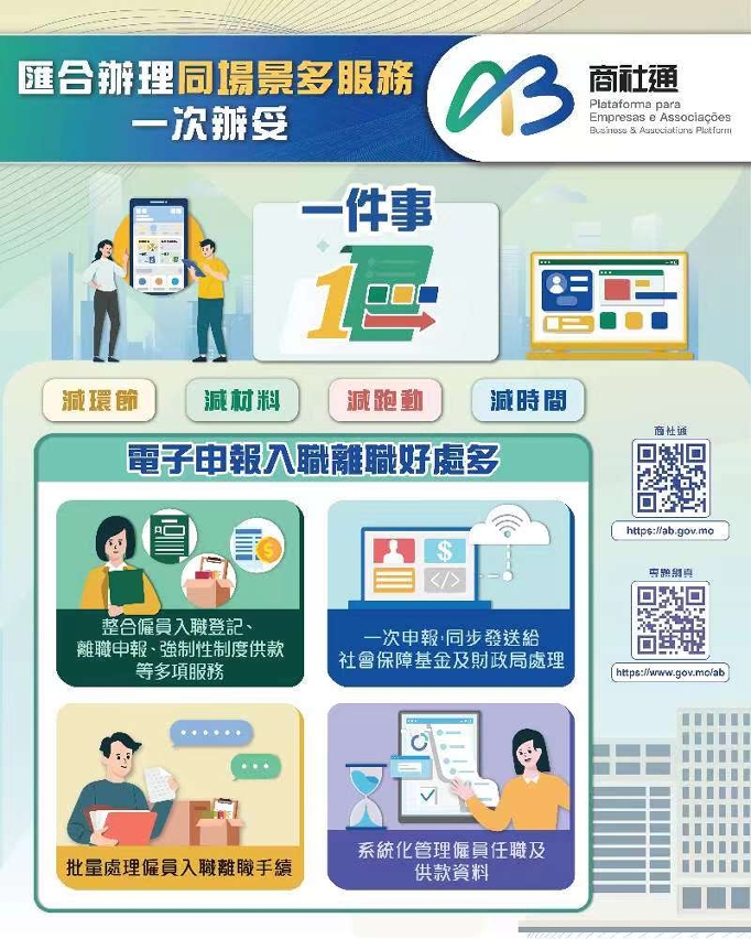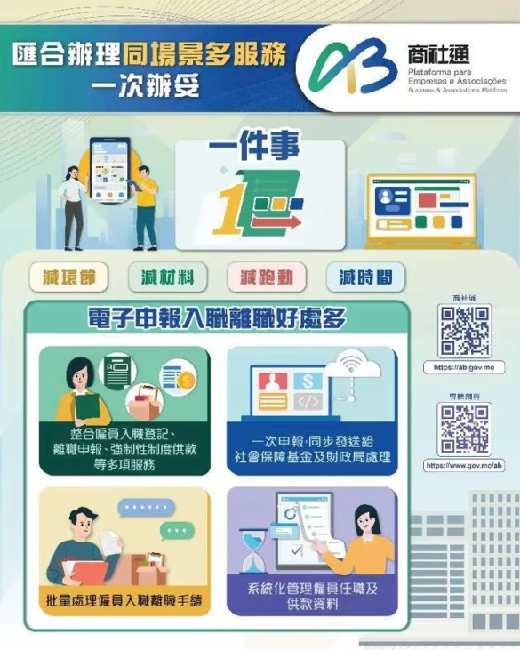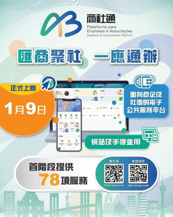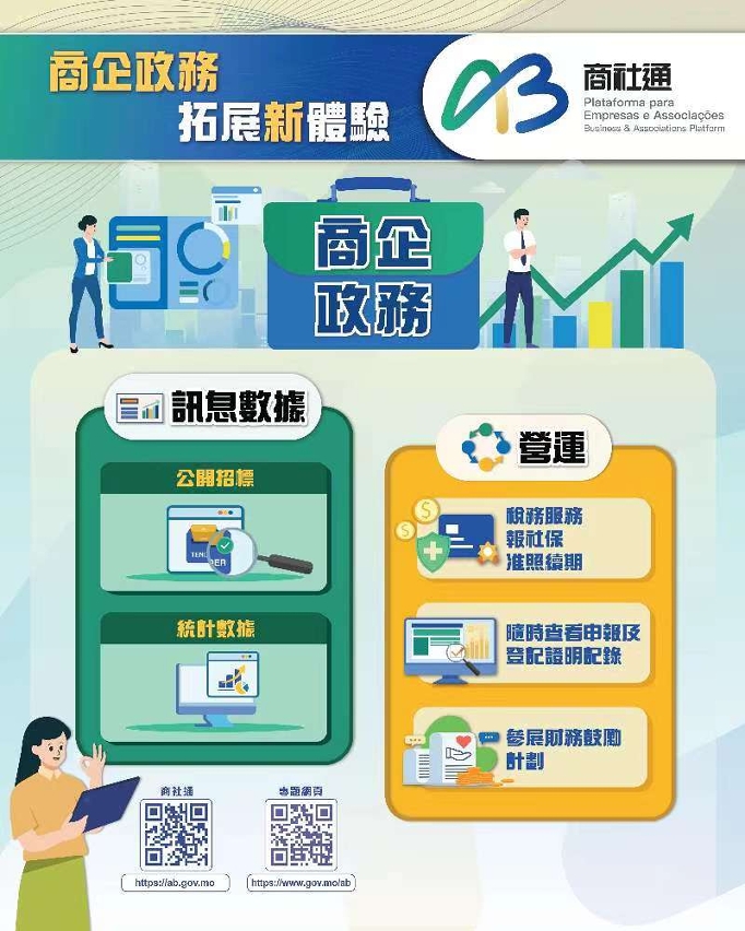 行政公職局表示商社通聯動多個部門,可匯合辦理多個政務。企業現可透過商社通,一次性電子申報僱員入職和離職業務,當中包括強強制性制度供款、社保等服務。當局亦梳理和優化飲食及飲料場所牌照的發牌程序,透過商社通可一站式和聯合審批相關申請。此外,企業和社團可在應用程式中,自選訂閱政府資訊的動態更新,包括經濟金融、人口就業、公開招標等資訊。