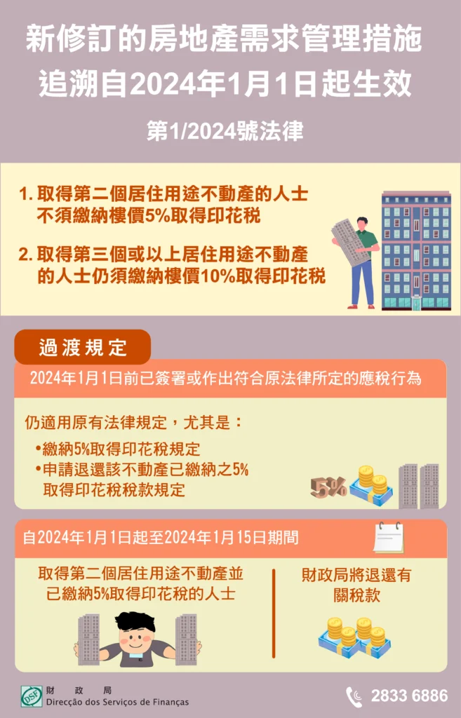 對於2024年1月1日前已簽署或作出涉及取得第二個居住用途不動產的文件、文書及行為,則仍繼續適用原有法律的規定。財政局將主動向自2024年1月1日至2024年1月15日期間取得第二個居住用途不動產並已繳納百分之五取得印花稅的人士退還有關稅款。