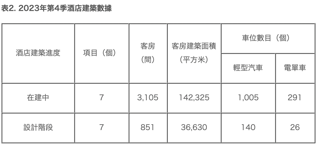2023年第4季的酒店項目,有7個在建中,共可提供3,105間客房;另外還有7個酒店項目處於設計階段,預計提供851間客房。