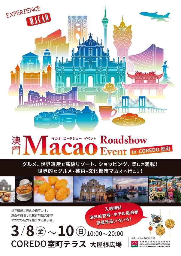 此次路展活動將於3月8至10日在東京COREDO室町Terrace大屋根廣場舉行,同時澳門航空及六家綜合度假休閒企業也會參與,推廣旗下旅遊設施及新元素,並推出各類優惠旅遊產品。例如,澳門旅遊局與航空公司合作推出往返澳門和日本的機票優惠。致力於吸引日本旅客來澳旅遊。