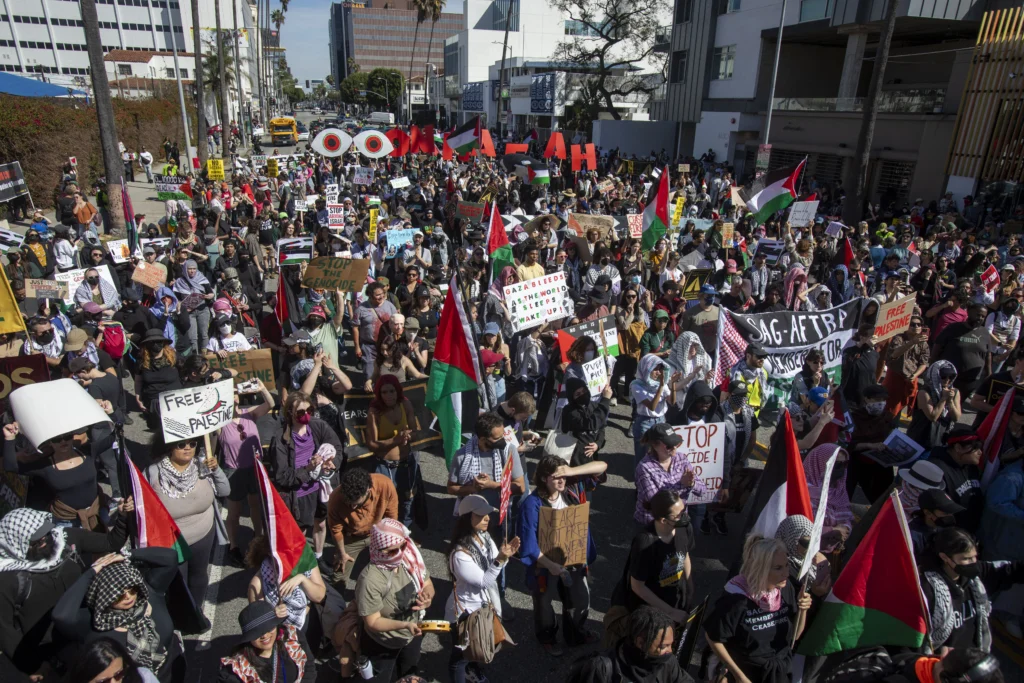 場外亦充斥反戰意味,有支持巴勒斯坦的民眾在場外集結示威,有人拉起寫著「沉默是暴力」的橫額,促請關注巴勒斯坦民眾的情況。因示威者堵路,荷里活一條主要道路癱瘓,在場有警員戒備。有部份頒獎禮出席者需落車徒步進入會場,亦有人無法趕在頒獎禮前進入會場。