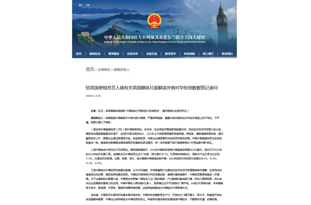發言人強調,總體來看,中國經濟長期向好的基本面沒有改變,中國加快發展新質生產力,開放的大門越開越大,高水平、制度型開放的含金量越來越高,中國也必將持續成為外商投資的熱土。希望有關媒體客觀全面報道中國經濟,不要錯失機遇、反噬自身。