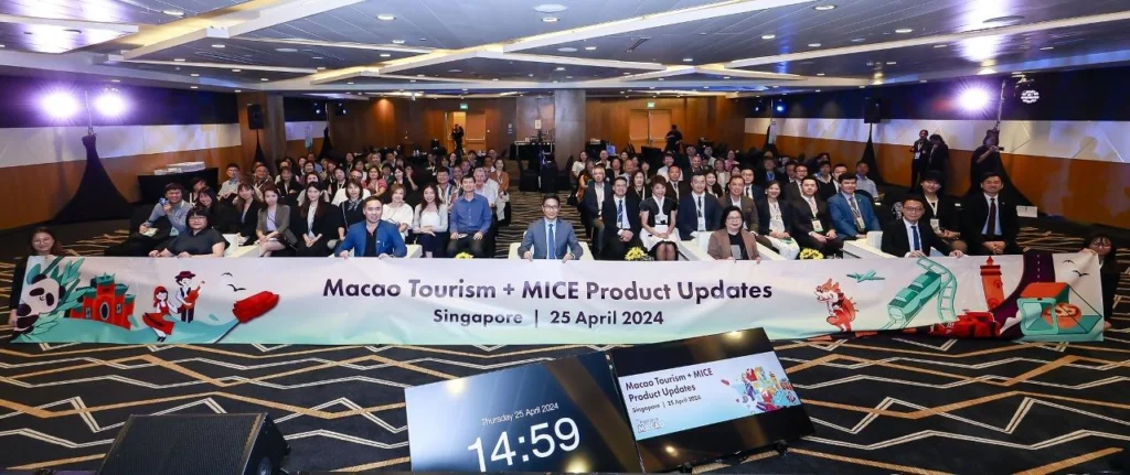澳門「旅遊+會展」最新產品資訊推介及洽談會於4月25日在新達城會議中心舉行。澳門特區政府旅遊局副局長程衛東、新加坡全國旅行社協會執行委員會秘書長陳章豪、澳門貿易投資促進局行政管理委員會執行委員黃伊琳和橫琴經濟發展局文旅會展商貿處處長林衍傑等嘉賓,聯同澳門六大綜合度假休閒企業代表、澳門和新加坡旅遊業界等逾100人出席活動。