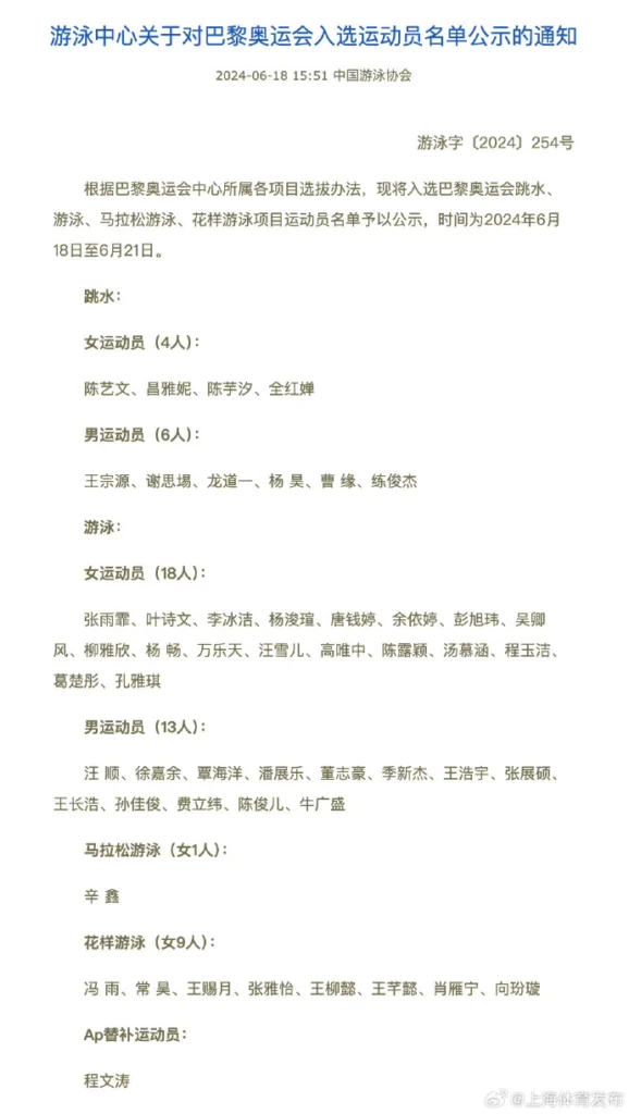這些獲選參與巴黎奧運的涉事運動員包括張雨霏、葉詩文、李冰潔、楊浚瑄、湯慕涵和汪順等奧運金牌選手。美國反興奮劑機構主管Travis Tygart對此事表示強烈批評,指責WADA,因中國政府曾捐獻了人民幣約 1,500 萬元,在處理該案時有掩蓋之嫌。