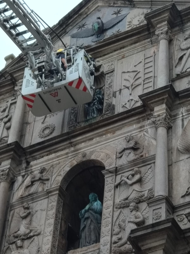 現時,文化局正安排對壁龕及銅像進行修復及清潔,以及對大三巴立面進行全面性的詳細檢查。同時,因應近年極端天氣頻生,文化局將持續與文化遺產研究院等專業文保機構研究應對方案,包括在文物保護原則下,研究在大三巴加設避雷系統的可行性,盡力降低惡劣天氣對文物建築的影響。