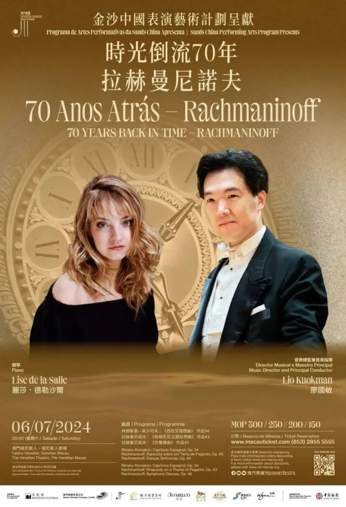 由文化局、澳門樂團有限公司、金沙中國表演藝術計劃呈獻的澳門樂團《時光倒流70年——拉赫曼尼諾夫》音樂會即將上演,澳門樂團音樂總監兼首席指揮廖國敏聯手法國鋼琴家麗莎.德勒沙爾,為觀眾呈獻俄國作曲家林姆斯基—高沙可夫和拉赫曼尼諾夫三首作品。
