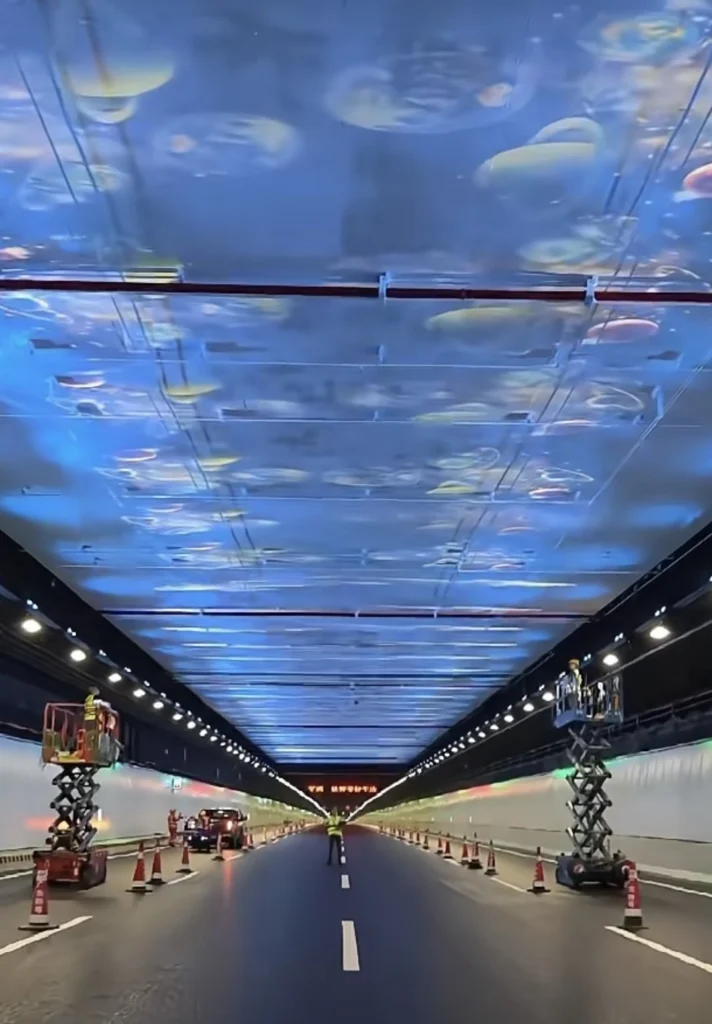 據報道,深中通道管理中心負責人表示,除景觀燈帶外,隧道中段採用天幕投影形式,將圖案投影到隧道頂部,長度約150米,主要用於緩解駕駛員行車疲勞。