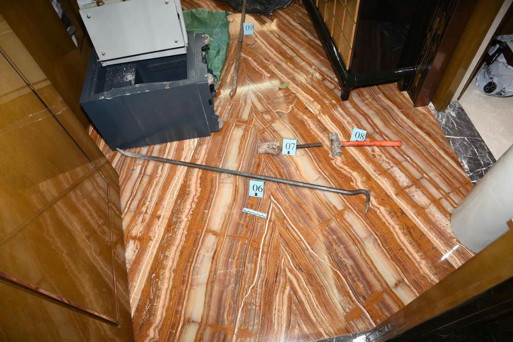 案情顯示,司警於本月4日下午一時許接報西望洋馬路某別墅發生入屋盜竊案件,自稱屋主的親戚報稱因屋主外出旅遊,委託其每日到別墅打點家居雜務。當日,該名親戚發現別墅大門旁邊玻璃窗被打碎,地上遺留大量血跡,屋內有被搜掠痕跡,原放於房間的保險箱被移至走廊並被人用工具撬開,保險箱旁遺有鐵筆、鐵錘、鐵鏟等懷疑作案工具。