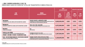 判給價格龐大的工程中,與輕鐵相關的工程位居榜首。輕鐵的在建工程耗資超過127億澳門元,佔超過一億的在建工程大約25.8%。此外,值得注意的是A區的公屋建設投資,共有15項工程正在進行中,其中不包括配套建築物和其他基礎設施。這些項目判給價格合共超過200億澳門元,即佔超過一億的在建工程判給總價格的41%。