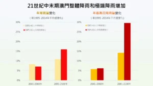 如圖1所示,無論是中等排放情景或非常高排放情景,研究顯示,澳門的整體降雨量和極端降雨事件將有所增加: