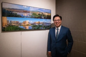 金沙中國行政副主席王英偉博士,在兩幅描繪路氹金光大道過去二十年演變的照片前留影。
