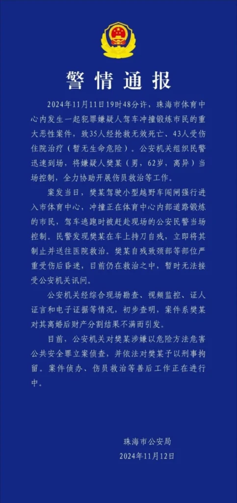 案件發生後,中共中央總書記、國家主席習近平高度重視,立即作出指示,強調珠海駕車衝撞事件性質惡劣,要求全力救治傷者,妥善處理善後事宜,並依法嚴懲肇事者。習近平強調,各地要從中汲取教訓,全面加強風險防控,及時化解矛盾糾紛,避免類似事件再度發生,切實保障民眾的生命安全和社會穩定。
