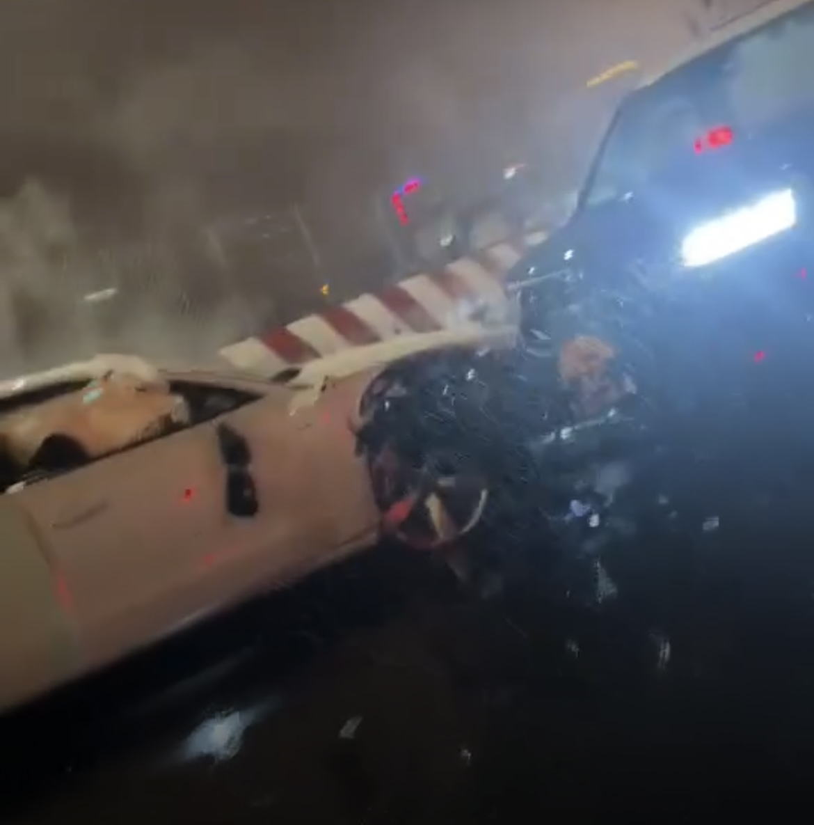 事發於今午夜零時30分,一架私家車在友誼大馬路往漁翁街方向,近大賽車看台路段逆駛,途中與3架電單車相撞。私家車司機不顧而去繼續逆駛,之後再撞向一架的士。私家車及的士車車頭損毀,安全氣囊彈出。意外加上天雨令交通一度擠塞,車龍廷伸至水塘馬路。