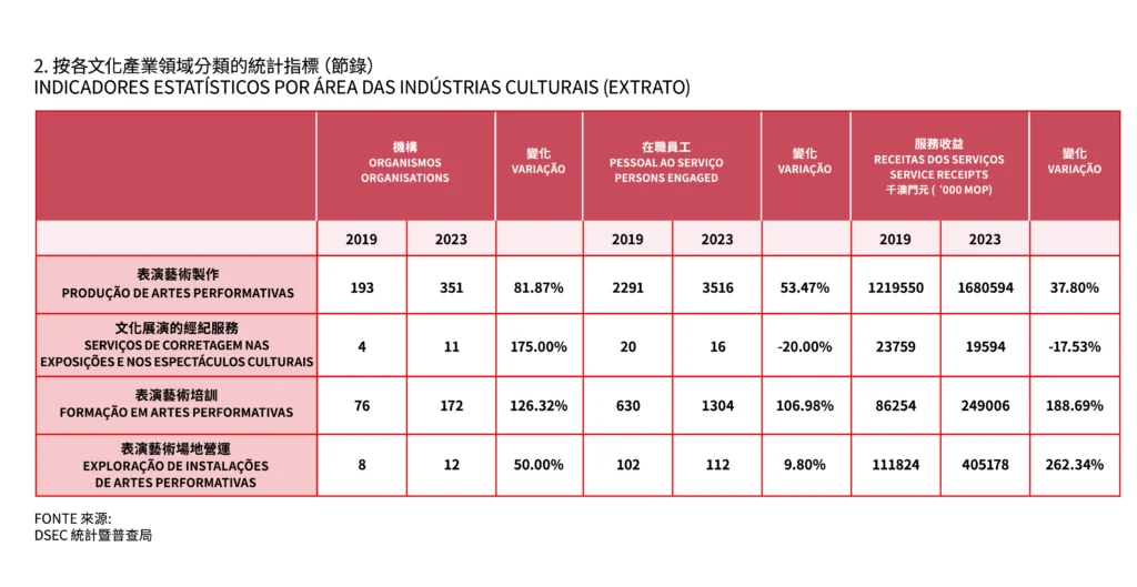 另邊廂,在非博彩元素的增加下,就機構數目而言,「文化展演的經紀服務」的數目由2019年的4間,暴升至2023年的11間,增幅為175%;「表演藝術培訓」和「表演藝術製作」的機構數目亦分別上升126.3%和81.9%。但服務收益與機構數目的升幅並不一致。例如「表演藝術培訓」的服務收益升幅達188.7%,「表演藝術場地營運的服務」收益升幅更達262.3%,但「文化展演的經紀服務」的服務收益較2019年縮減了17.5%。