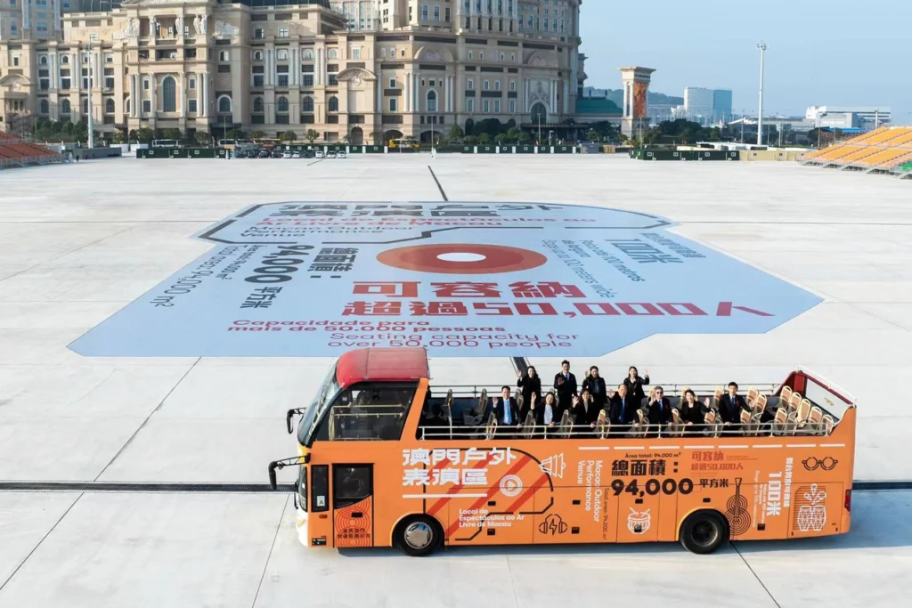 戶外表演區位於路氹機場大馬路與網球路交匯處,佔地94,000平方米,設有可容納超過50,000人的場地。舞台跨度可達100米,並配有靈活的設施來應對不同規模和設計的演出需求。觀眾區兩側設有六座看台,地面觀眾席可依據演出需求進行調整,並設有站立區與座位區。舞台後勤區包含藝人休息室、技術辦公室及舞台設備存放區等設施。