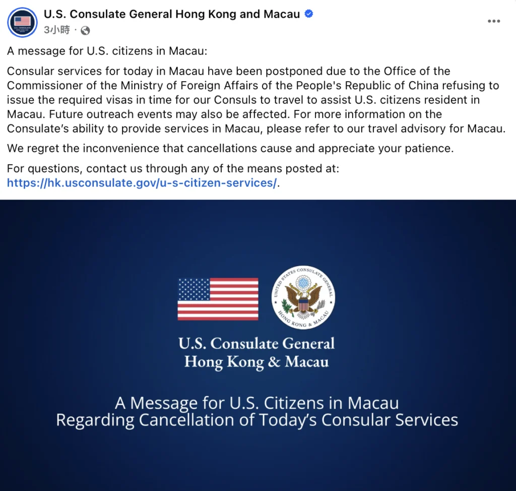 在Facebook聲明中指出,由於未能獲得簽證支持,領事團隊無法按時抵達澳門,無法為在澳門的美國公民提供預定的服務。美國駐港總領事館還表示,這一事件可能對未來的外展活動產生影響,導致其他服務安排也可能受到影響。