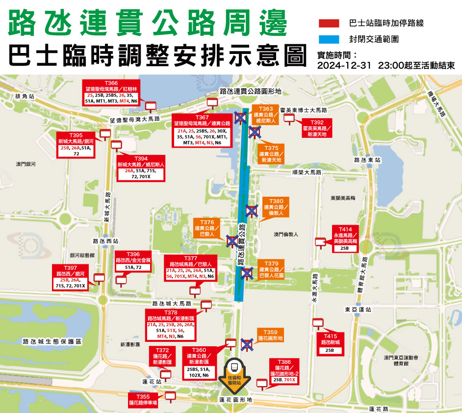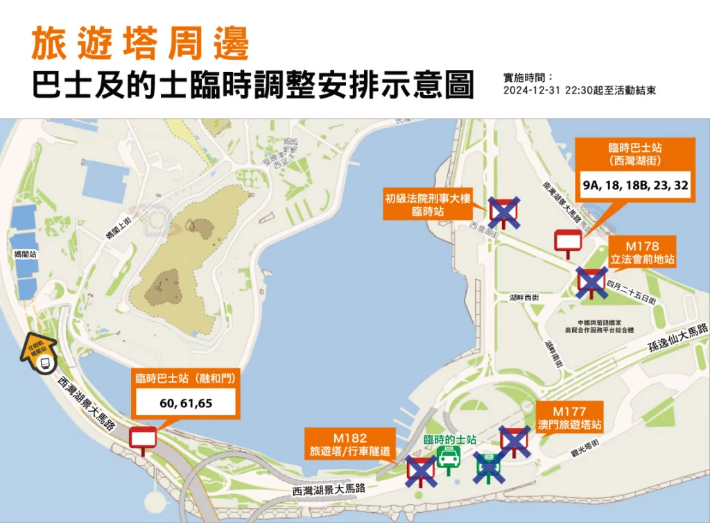 文化局已與治安警察局溝通交通管控安排,若超出預期人流,將採取人流管制。為配合活動,預計12月31日晚上7時至翌日凌晨1時,警方將實施車輛通行限制和封路措施(巴士、特許車輛及緊急服務車輛除外),交通管制區域將放置指示牌提醒駕駛者及市民。屆時,澳門旅遊塔一帶原有巴士站將臨時停用,市民可選用設於湖畔西街及融和門附近的臨時巴士站。