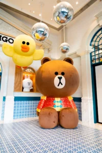 在LINE FRIENDS PRESENTS CASA DE AMIGO大堂及BROWN & FRIENDS CAFE & BISTRO,高約3米的MEGA BROWN身穿唐裝迎春,訪客打卡後分享至社交平台,可換領LINE FRIENDS新春祝福御守盲盒,將福氣帶回家。