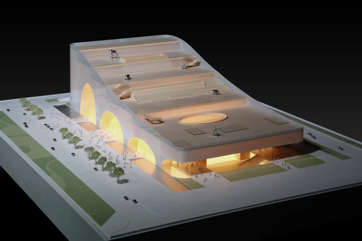 中心位於山水之間,周圍環繞著住宅大樓和城市公園,其建築採用梯田式設計,一道拱門從山延伸至河,與景觀和諧融合。地面層的三個宏偉拱門為訪客帶來通透流暢之感。設計在某種程度上呼應了巴西現代建築大師Oscar Niemeyer的標誌性風格,自然光通過天窗傾瀉入室內空間,連接頂部花園,創造出擁有絕美山河景觀的露天舞台。