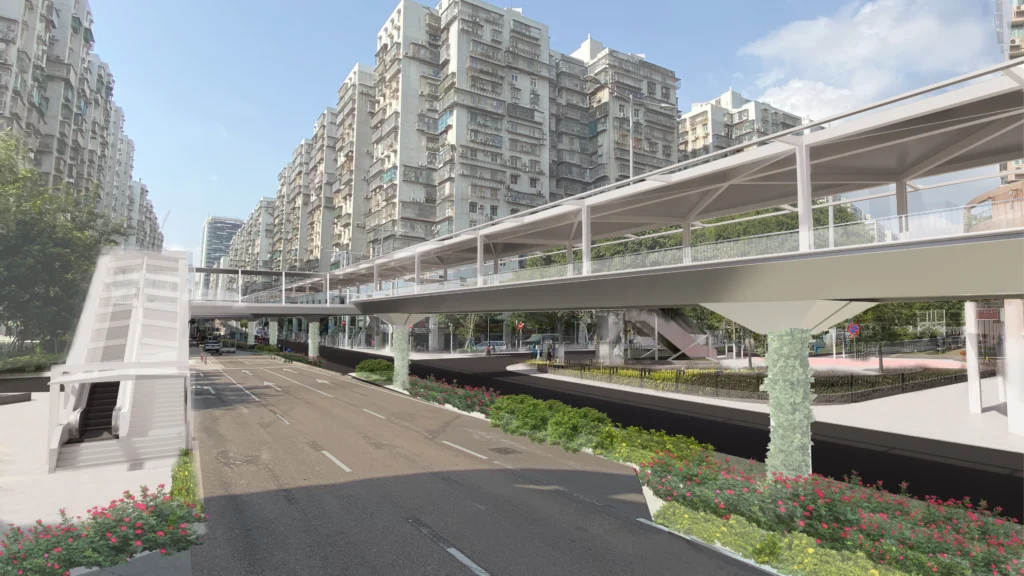 長約600米的東北大馬路空中走廊空中走廊,沿途設置12個落腳點,並與慕拉士社屋的公共連廊連接。橋面行人通道淨寬度不少於4米,並配置無障礙設施。