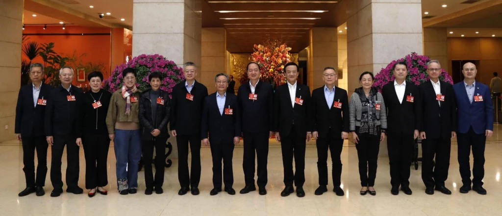 澳門中聯辦主任鄭新聰(中)與十二位澳區全國人大代表劉藝良、吳小麗、何雪卿、何敬麟、陳虹、施家倫、高開賢、容永恩、黃顯輝、蕭志偉、崔世平、溫能漢。