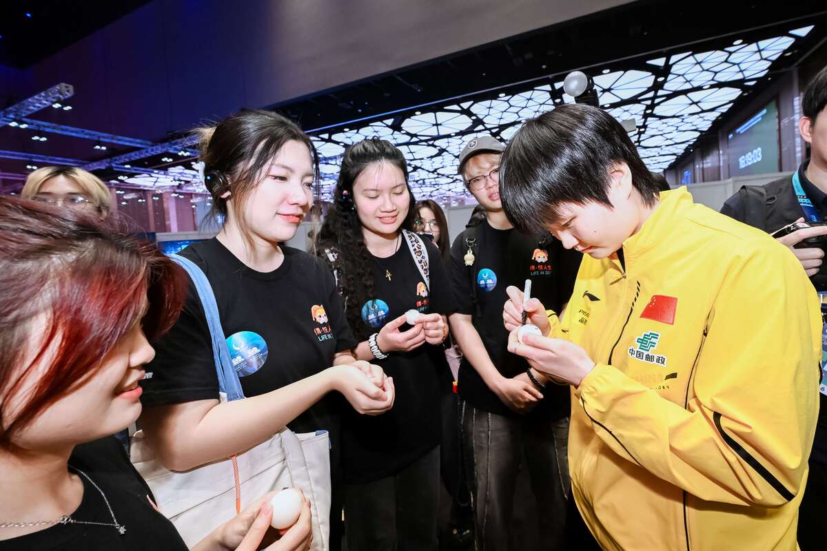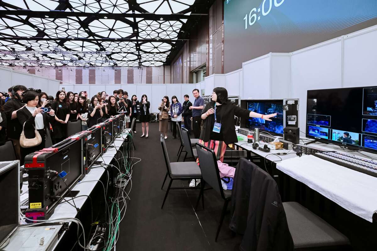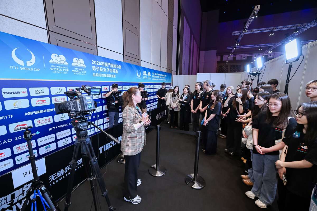 隨後,一眾學生到後台區域參觀混合採訪區、媒體中心及新聞發佈廳,並於現場與中央廣播電視總台乒乓球項目導演王鵬女士以及《澳門日報》記者莊偉豪先生互動交流,進一步深入學習大型國際體育賽事的傳媒流程及實務操作。一眾學生更獲得機會與中國乒乓運動員朱思冰女士近距離接觸並合影留念。