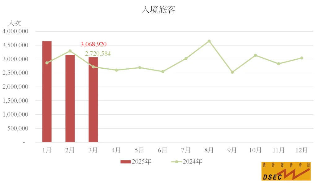 單計2025年3月,入境旅客總數為3,068,920人次,較去年同期增加12.8%。