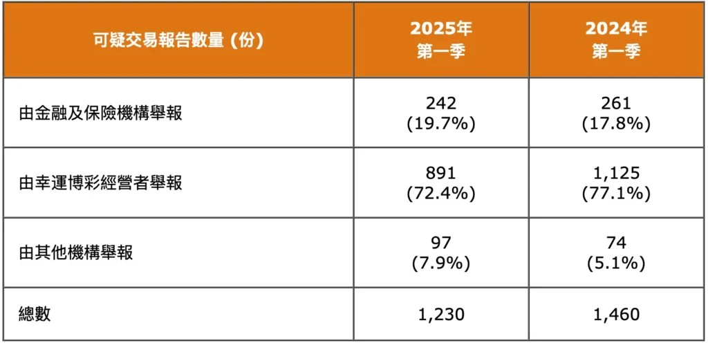 按行業劃分,博彩業提交的報告仍佔最大比重,共891宗(72.8%);金融業有242宗(19.7%);其餘8%則來自其他機構。