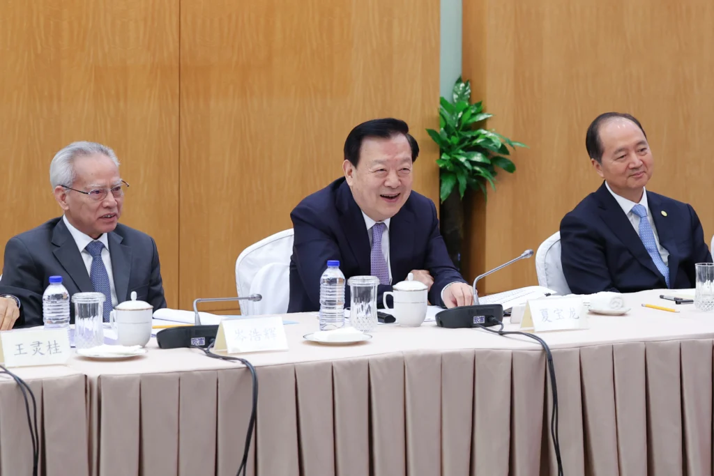 陪同參與此次座談的有,澳門特別行政區行政長官岑浩輝、中央人民政府駐澳門聯絡辦公室主任鄭新聰以及行政法務司司長張永春等人。