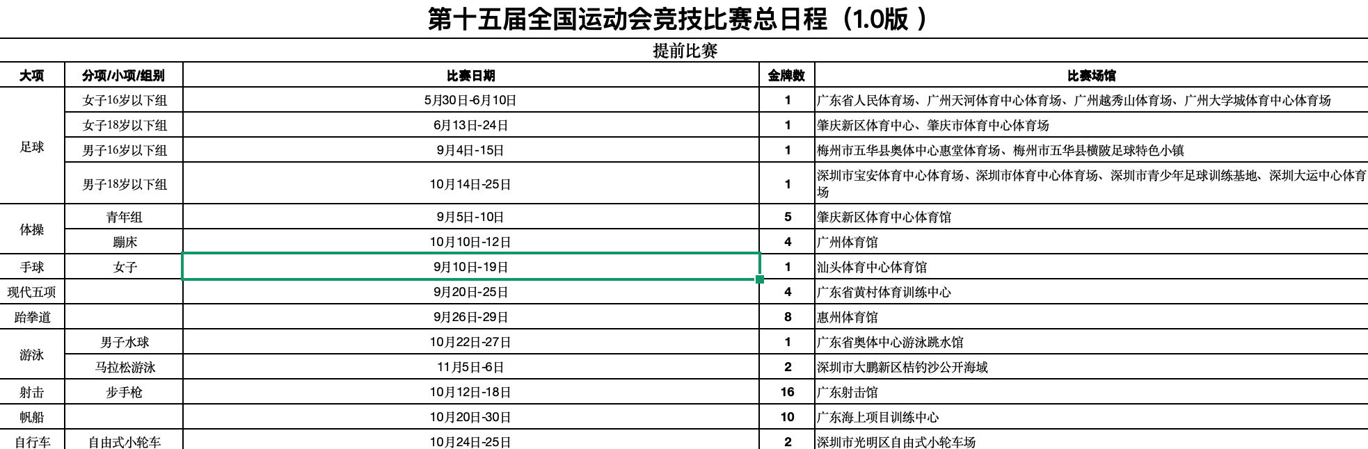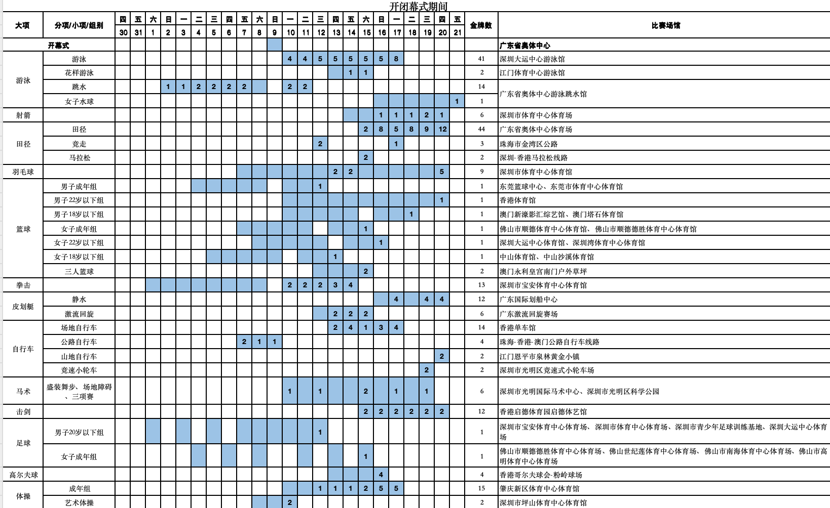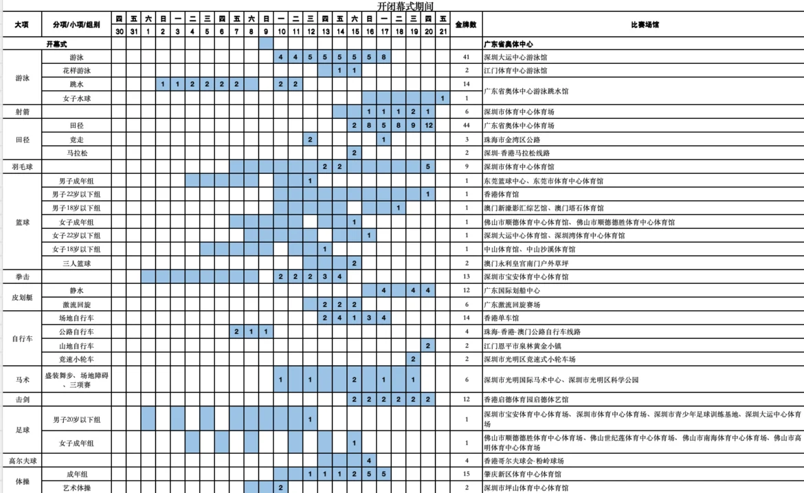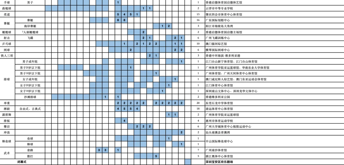 其中,乒乓球賽事將於11月11日至20日在澳門銀河綜藝館舉行(12日、17日及18日為休賽日);3人籃球比賽定於11月15日在永利皇宮南門戶外草坪登場;5人籃球(男子18歲以下組)將於11月18日分別在新濠影匯綜藝館和塔石體育館開打;而排球(女子成年組)賽事則安排於11月19日在威尼斯人綜藝館和東亞運動會體育館舉行。
