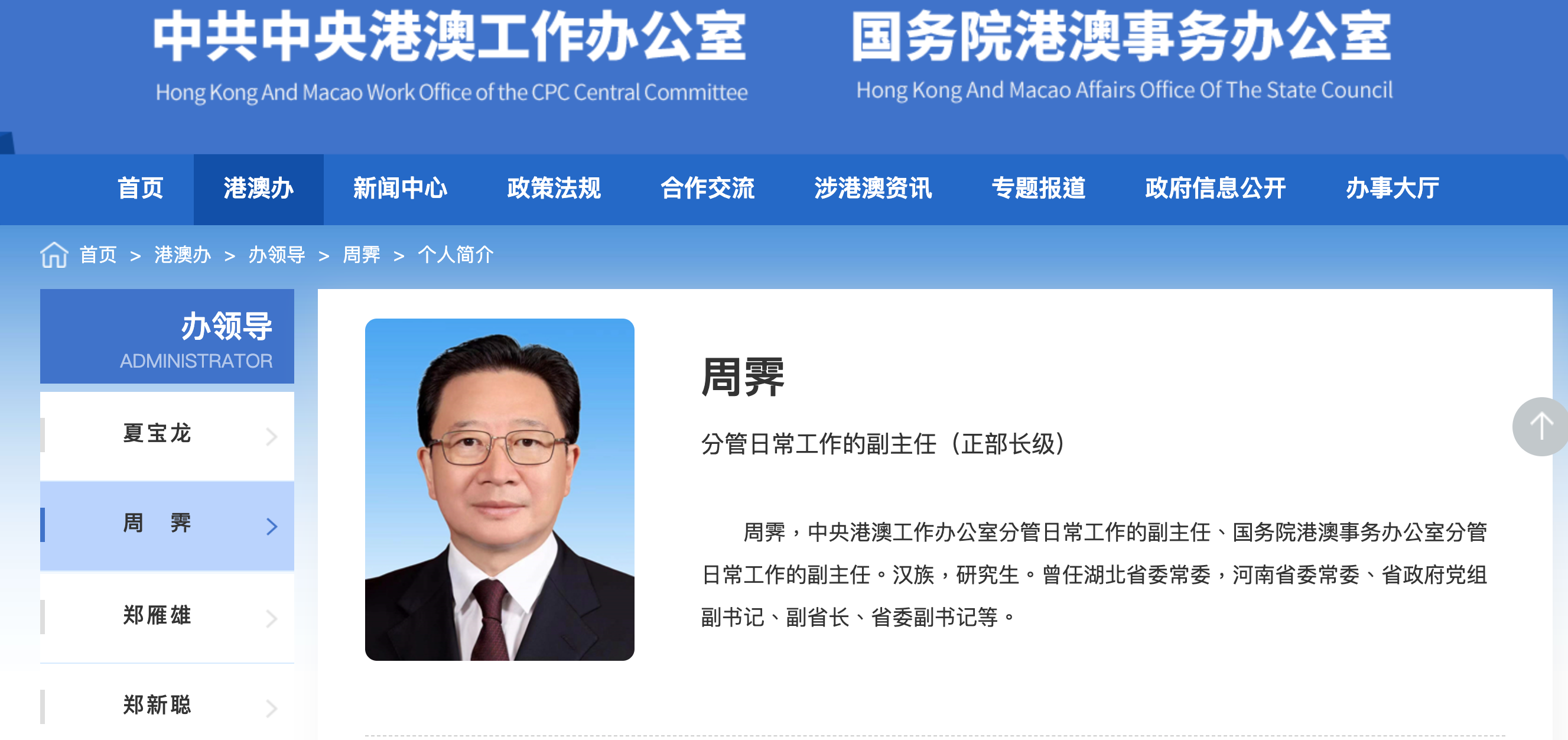 新任中聯辦主任周霽現年60歲,是湖北襄陽人,長期在內地地方任職。他曾擔任河南省常務副省長、中共河南省委副書記、政法委員會書記等職務。2023年7月起,他出任正部級的港澳辦副主任,被外界視為港澳辦的接班人選。