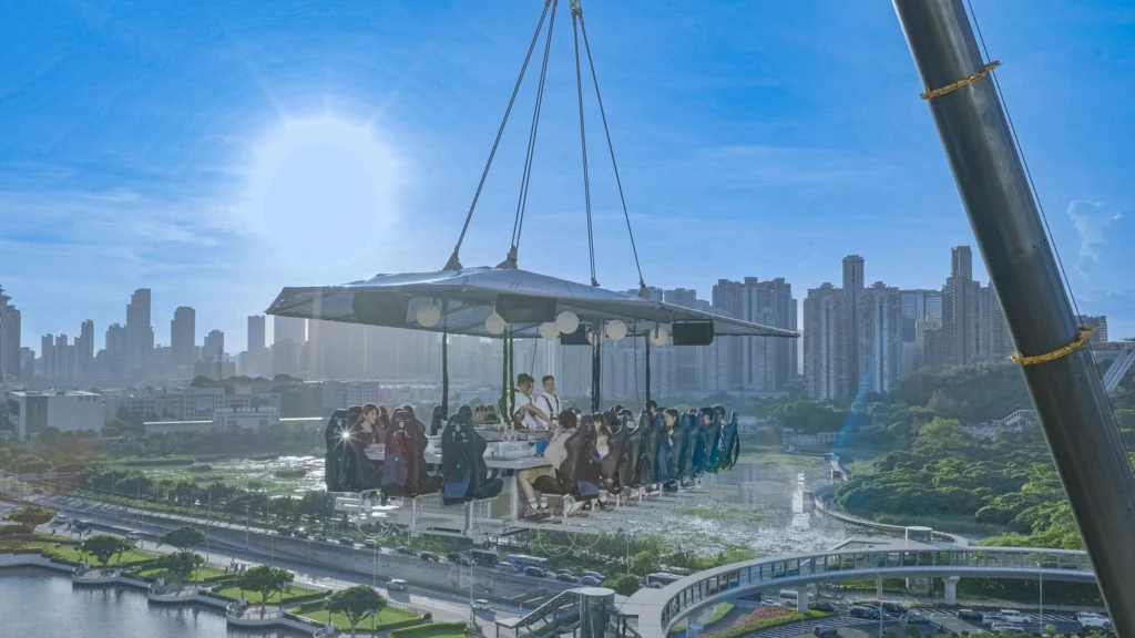 重達6噸的金屬平台配備頂罩、吊燈及觀景桌,賓客可一邊享用五星級餐飲,一邊360度俯瞰澳門及路氹城天際線。開放預訂時段為早上10:15至晚上10:00,提供午餐、下午茶及晚餐三種套餐,開業優惠價由888澳門幣起,另設包場服務。