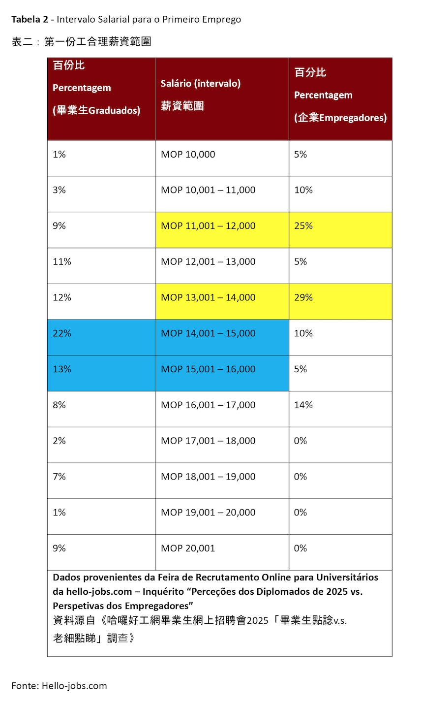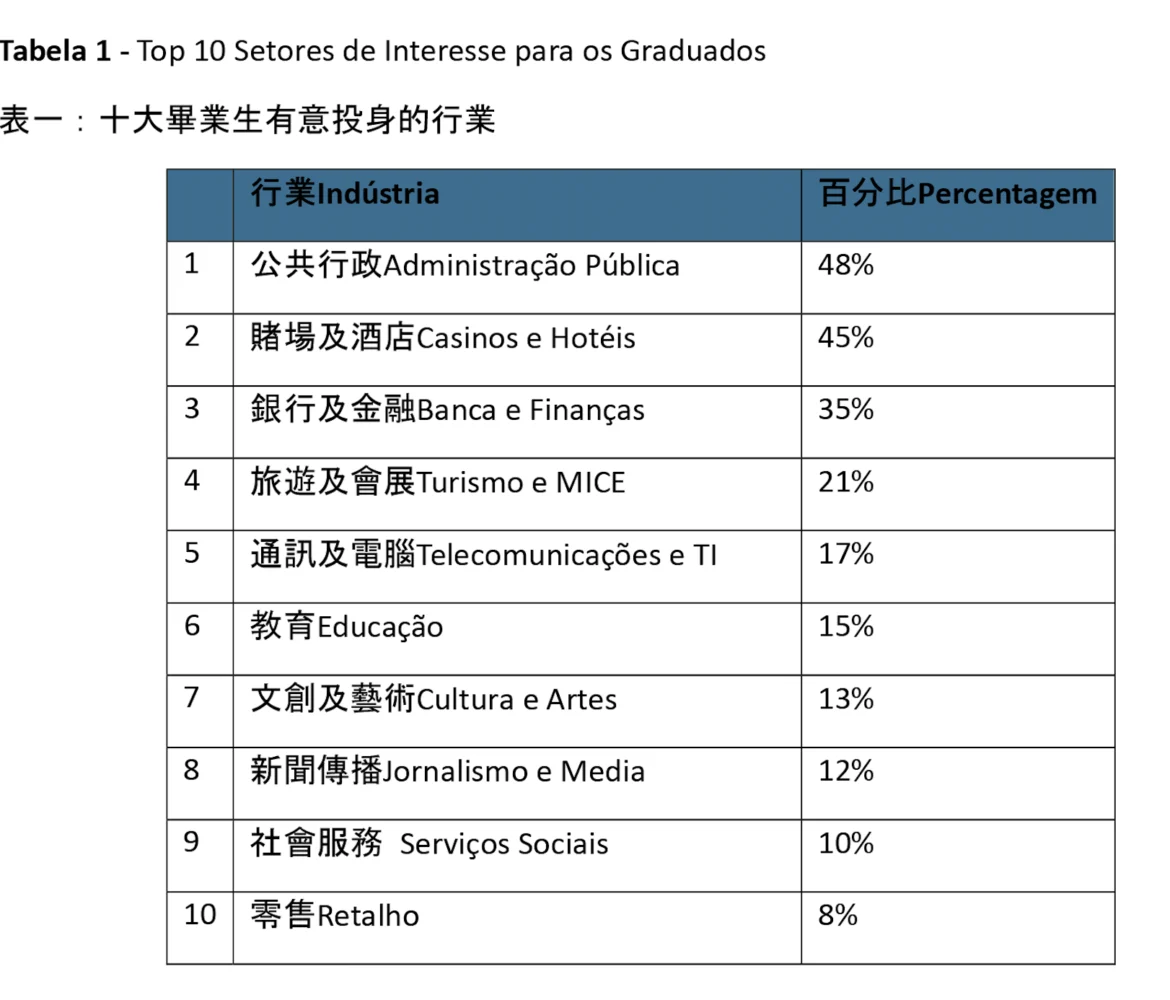 儘管政府推出多項支援計劃與補貼措施,不少剛畢業的年輕人對於前往大灣區工作仍抱觀望態度。他們普遍傾向留在本澳,尤其偏好投身政府工行列。根據招聘平台Hello-jobs.com的數據(見表一),公職是最受歡迎的就業選項,多達48%的應屆畢業生表示對此感興趣。