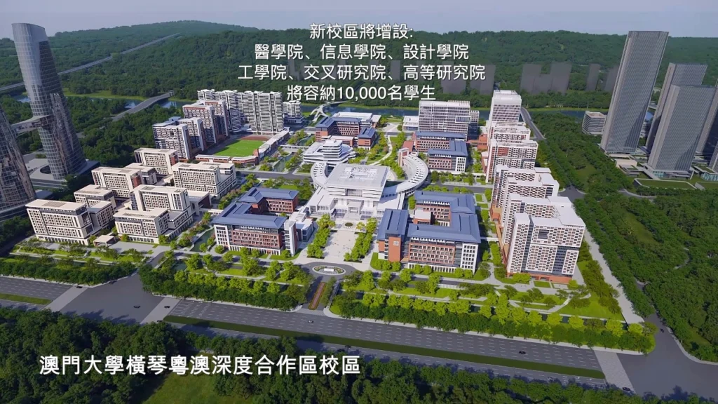 澳門大學橫琴校區位於橫琴粵澳深度合作區西南部,總用地面積約37萬平方米,建築面積達83萬平方米。校區計劃新增醫學院、信息學院等多個學術單位,預計可容納1萬名學生,並於2028年8月投入使用。