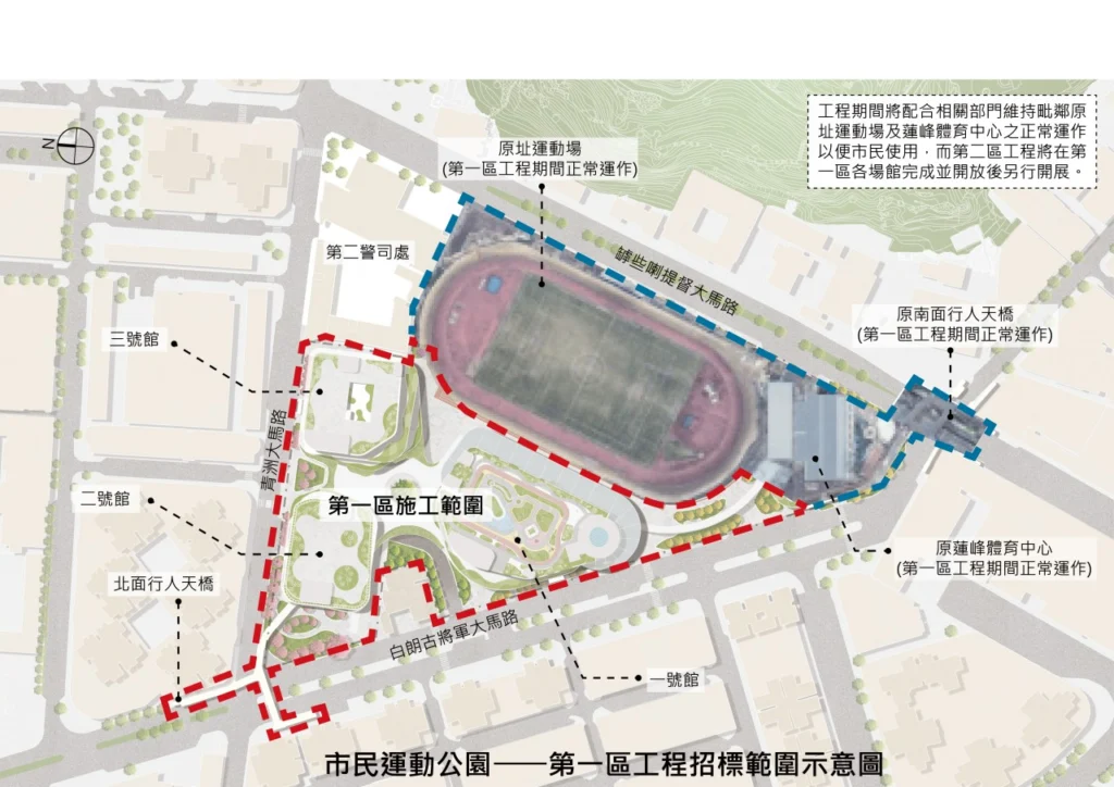 公共建設局指第一區工程包括拆卸原有的建築物,並建造三棟場館大樓。第二區的工程則待第一區工程竣工並開放後再開展,包括兒童館及田徑場。當局指現有的電信機樓房維持正常運作, 直至新機房建成營運才會拆卸。施工期間維持毗鄰原址運動場及蓮峰體育中心正常運作。