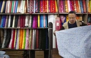 銀宮疋頭公司現任東主鄭耀光正在整理店內陳列的布匹。草堆街的布業貿易已有逾兩百年的歷史,在1970至1990年間最為興旺,當時街上有超過20間疋頭公司及30多間相關商戶。(圖片:《澳門平台》)