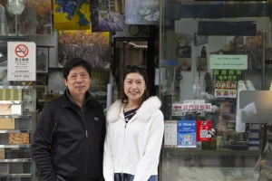 羅明輝(父親)與羅詠芝(女兒)於昌盛鏡業店舖前合影。該店由羅詠芝的曾祖父於1949年創立。(圖片:《澳門平台》)