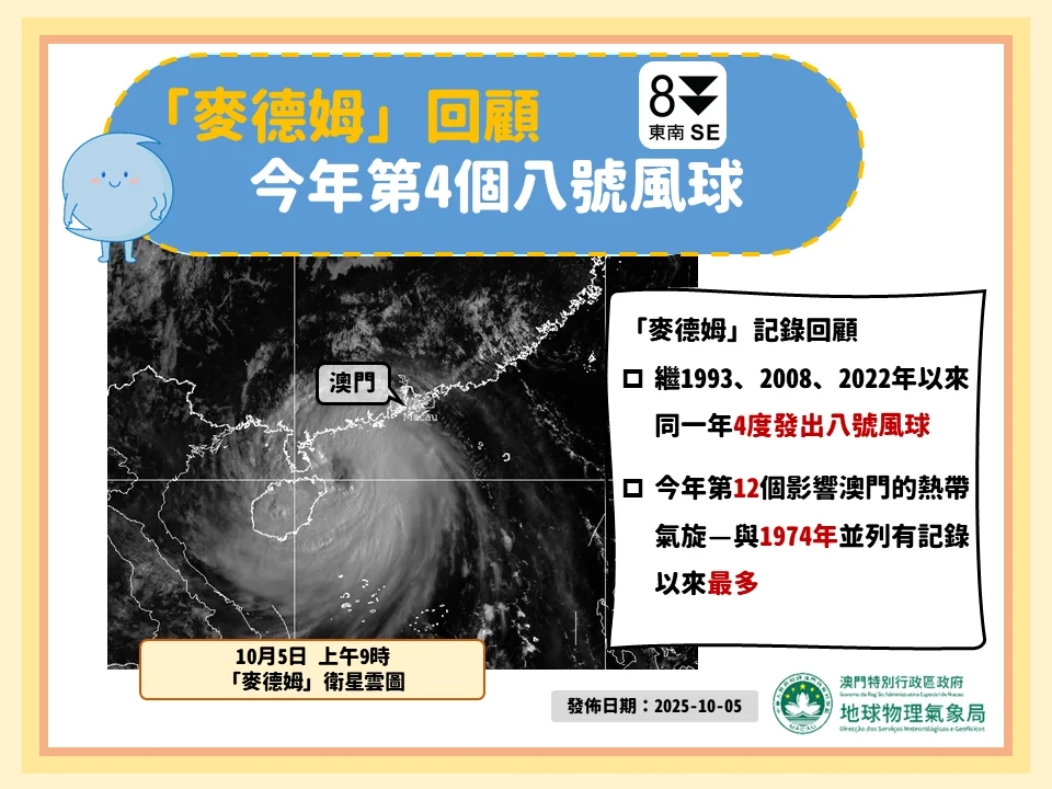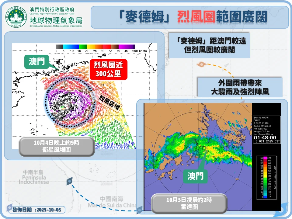 氣象資料顯示,「麥德姆」影響期間,澳門各區錄得最高10分鐘平均風速達10級,陣風甚至達12級。氣象局指出,颱風中心雖距澳門約300公里,但其烈風範圍廣闊,加上雨帶帶來強烈陣風,使本澳空曠地區及跨海大橋風力長時間維持在8級或以上,顯示風球判定不僅取決於距離,而更關乎風力覆蓋範圍及環流結構。